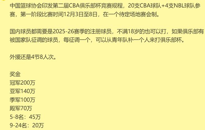 第二届俱乐部杯的安排挺有意思的,可以说和第一届有很大的区别。首先不再是全部安排在CBA联赛常规赛中途,而是小组赛在2025-26赛季的正常开始前;其次,也不再是只有CBA的20支球队参加,而是“扩军”了,允许NBL.联赛的四强球队也参与其中,总共是24支球队参加比赛。
