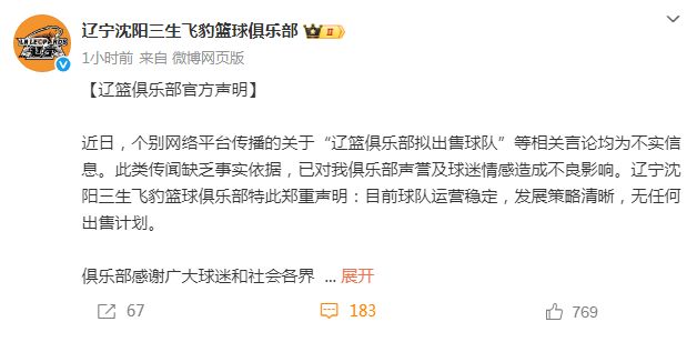 近日,个别网络平台传播的关于“辽篮俱乐部拟出售球队”等相关言论,均为不实信息。此类传闻缺乏事实依据,已对我俱乐部声誉及球迷情感造成不良影响。辽宁沈阳三生飞豹篮球俱乐部特此郑重声明:目前球队运营稳定,发展策略清晰,无任何出售计划。俱乐部感谢广大球迷和社会各界的关心与支持,并呼吁大家勿轻信、传播未经证实的消息。未来我们将继续全力以赴,为辽宁篮球事业贡献力量。相关信息请以俱乐部官方渠道发布为准,特此声明。