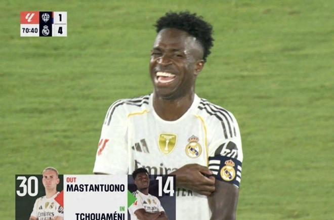 下半场,主帅阿隆索用贝林厄姆换下巴尔韦德。维尼修斯接过了队长袖标,成为球队最后20分钟的场上领袖。