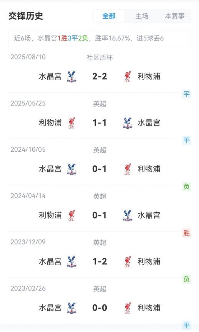 利物浦5战全胜积15分,排名英超第1;水晶宫2胜3平积9分,排名英超第5。