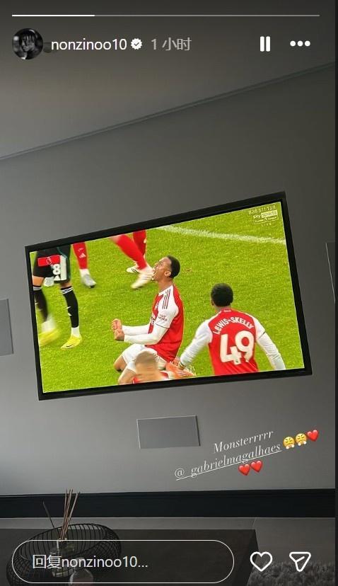 密切关注队友表现!马杜埃凯晒看球照,称赞加布里埃尔为“野兽”