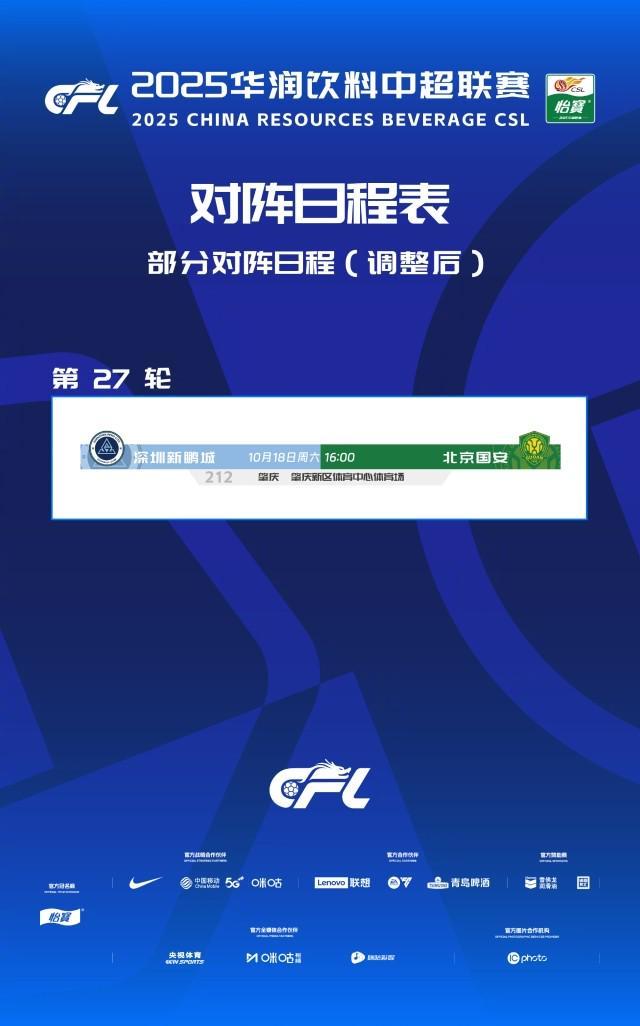据中超官方微博报道,根据2025华润饮料中超联赛赛程,深圳新鹏城对阵北京国安的比赛将于10月17日20:00在深圳市体育中心体育场进行,因深圳赛区举办第十五届全运会足球男子U18比赛,为保证本场比赛安全有序进行。经深圳新鹏城足球俱乐部申请,协商深圳赛区、北京国安足球俱乐部以及有关方面同意,现决定将深圳新鹏城对阵北京国安比赛进行调整,具体调整如下: