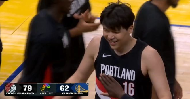 下半场,杨瀚森终于得分了,与队友挡拆配合期间,杨瀚森顺下轻松上篮得分,暂停期间小杨笑嘻嘻地与教练组击掌,终于露出了笑容;之后杨瀚森在禁区拼抢篮板并且补篮得分,篮下卖力防守逼迫勇士24秒违例,可惜外线三分再次打铁,单节3中2拿到4分2篮板,一顿操作后杨瀚森明显累了,双手扶着膝盖直喘粗气。