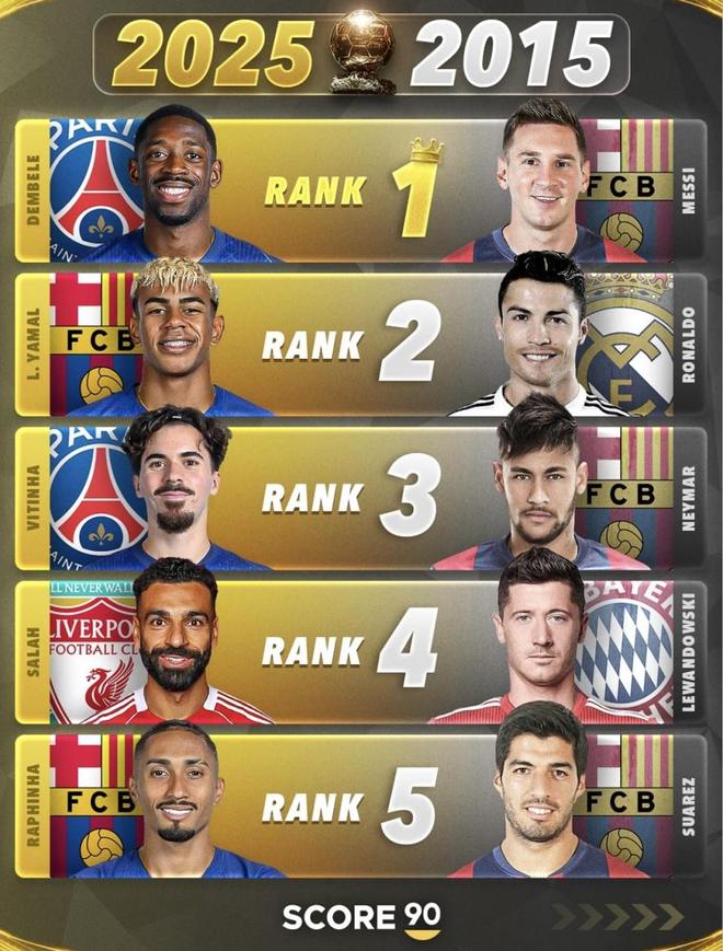 还在争论“老炮儿”强,还是“新核”猛?把2015的梅西、C罗、内马尔、莱万、苏亚雷斯,和2025的登贝莱、亚马尔、维蒂尼亚、萨拉赫、拉菲尼亚放一张桌上,你会发现:一边是极限解题+禁区重锤的成熟体系,一边是纵深拉满+转换提速的爆裂链条。若打一场不留情面的强度球,谁更稳、谁更炸、谁更会在第85分钟把比赛锁死,这篇就用五个维度、三种赛况把话说透;最后给出明确胜负比,看看你站哪边。