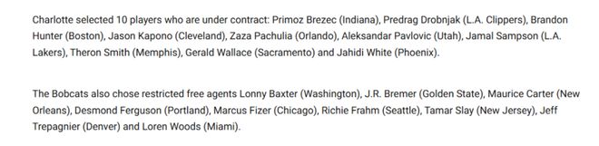 接下来,就是正经事,球员怎么选了。如我们所知,山猫队可以从其他球队里选择球员,联盟制定了几条规则,简单的版本如下:1.所有29支球队都有权利保护阵容中的8名球员,即上赛季结束时在队中的任何球员,包括受限制自由球员。2.每支球队限选一人;3.山猫队在新赛季被允许使用的工资帽是NBA正常工资帽的66%,最低工资开支也是联盟最低开支的66%;第二个赛季被允许使用的工资帽是正常的75%;4.没有对球员位置的限制,挑选球员发生在选秀大会前。