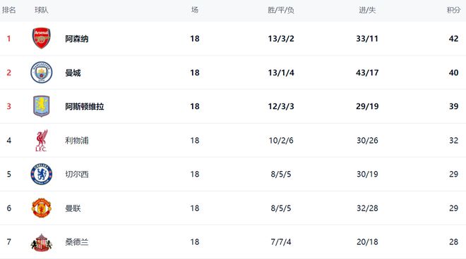 - 英超 | 英超积分榜!阿森纳2分领跑,曼城6连胜仅差2分,利物浦还有机会