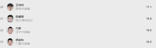 大前锋王浩然前十轮比赛场均17.1分排名本土得分榜第三,42%命中率的精准三分,加上出色的移动和篮板能力,21岁的他年轻有为,也值得入选国家队集训名单,他的培养价值甚至能超越胡金秋。