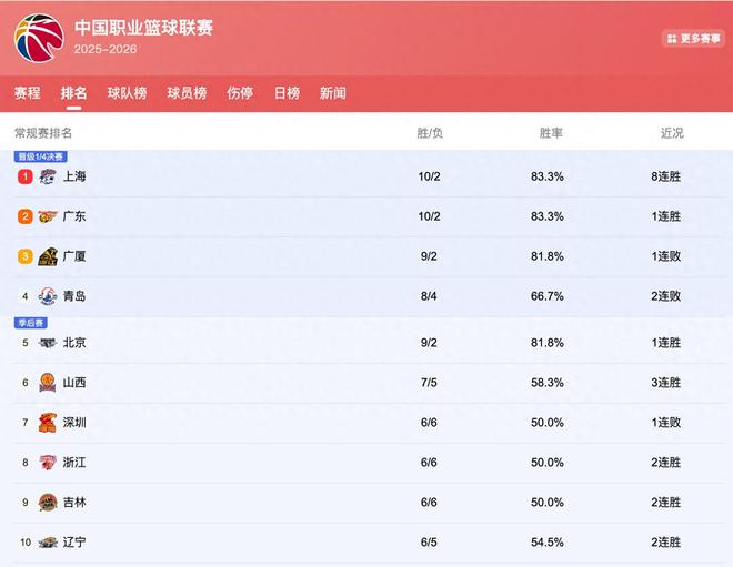 - CBA | CBA排行榜更新:沪粤厦前3,广东冲榜首辽篮第10,四川12连败