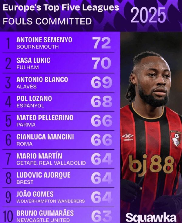 值得一提的是,在2025年,塞门约还是五大联赛中犯规次数最多的球员。他的防守技术并不算好,但就是靠积极性来帮助球队。