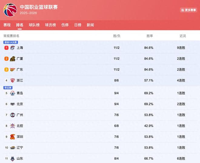 - CBA | CBA排行榜大变:北京掉出前5浙江挤进前4,广东冲第1,上海9连胜