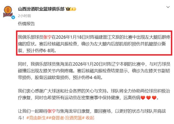 - CBA | 至少伤停6周!张宁严重拉伤,山西男篮官宣